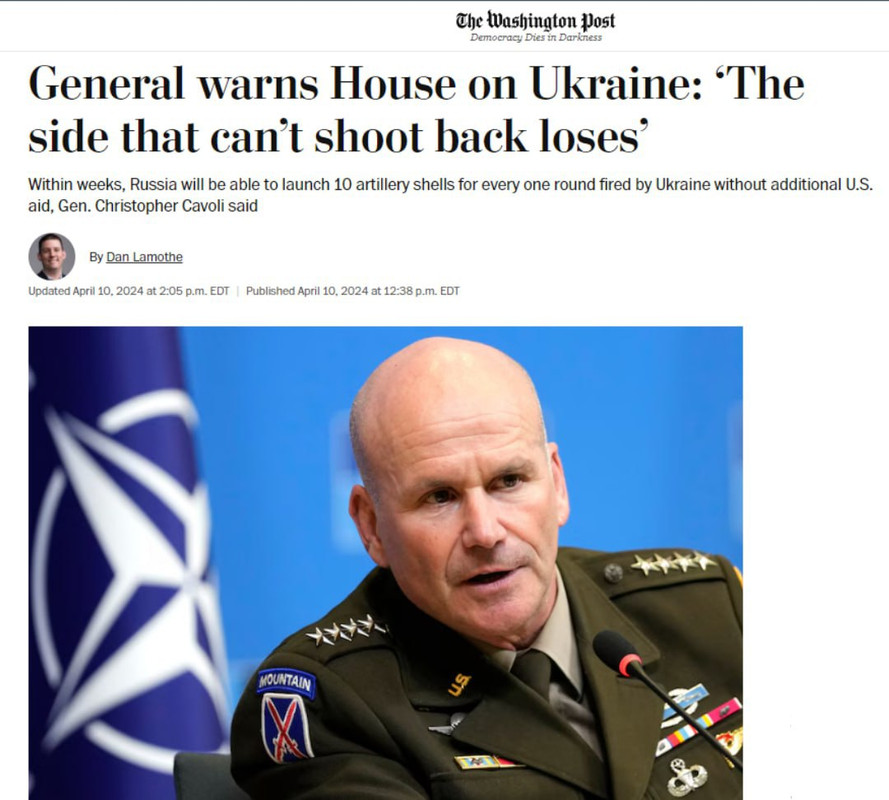 Через несколько недель Россия будет опережать Украину в артиллерии 10 к 1, заявил командующий силами НАТО в Европе Кристофер Каволи.