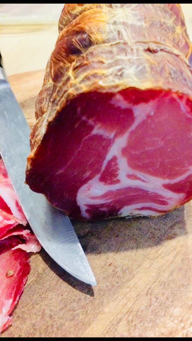 Играем в долгую.Конечно, еду можно приготовить Быстро.Можно очень быстро, например сорвав ягоду и засунув ее в рот. Но будет ли смысл в быстром вине? А в быстром сыре? С мясом случаются такие же метаморфозы.Зрелое мясо-это совсем другой вкус и органолептика. Итак: Свиная шея от 2,5 кг ( почему на меньше? Да только потому, что после приготовления мы лишимся 35-40 процентов веса) Соль, перец, чеснок, травы, вино. У коппы нет строгого рецепта как такового.Просто 35грамм соли на килограмм веса и приправы без фанатизма. Соль луче брать нитритную.Шея солится сухим посолом 8-10 дней, затем промывается, обсушивается и упаковывается в говяжью синюгу ( можно в коллагеновую пленку), плотно обматывается бечёвкой и отправляется на созревание.