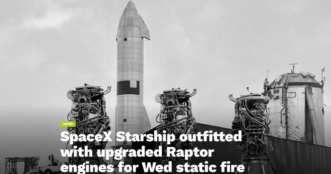 "SpaceX установила как минимум два из трех новых модернизированных Raptors на корабле Starship с серийным номером 15 (SN15) в преддверии статического пожара с тремя двигателями, запланированного на среду, 21 апреля."