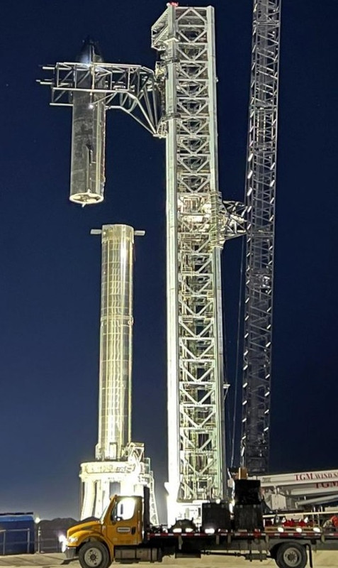 Однако на этот раз SpaceX использовала руки размером со здание, установленные на «стартовой башне» Starbase высотой ~ 145 метров (~ 480 футов), чтобы поднять, чтобы захватить звездолет, поднять массивную верхнюю ступень на высоту более 80 метров (260 футов). на землю и опуститься на сверхтяжелый ускоритель. После нескольких дней явного устранения неполадок и фальстартов, а также недель контрольных испытаний с мешками с водой весом от десятков до сотен тонн гигантский робот, казалось, работал идеально, останавливаясь только один раз во время подъема.