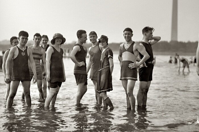 >> СССР уже запускал человека в космос, а в Западном мире ещё ни женщину, ни негра не запускали в автобус из-за кожи! что бы войти в автобус в футболке и речи быть не могло - ни для кого! КУДА ПРЁШЬ С ОТКРЫТЫМИ РУКАМИ В КАЛАШНЫЙ РЯД?! ... ... ... Но эта тема не про трусы, а про программирование общества на поведение и ношение.>> >> >> >> >> >> Парады физкультурников начались в Москве в 1919 году ещё в присутствии Ленина (присутствовал он на Мавзолее, а не там где все подумали). В рамках невиданной доселе концепции: "Женщина тоже человек!" (а не только товар с правом собственности) - потрясшей до основания тогдашний мир.>> >> В Европе и в остальном мире в это время бушевал лютый пуритантизм. Ни в кино, ни в быту женщине не дозволялось открывать даже лодыжки. Можете посмотреть Западные фильмы до 1960-х! :)>> Небольшое послабление было сделано для европейских женских пляжей - для удобства загара было разрешено ненадолго приоткрывать колени - во время купания!>> Фото факт подтверждающий сказанное:
