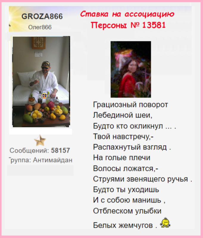 Сразу за ней на втором месте - восходящая звезда форума - специалист по угадыванию потаённых оттенков дамских переживаний! - Спрячь за высоким забором своё настроенье - выкрадет вместе с забором! Маэстро рифмы и волшебник перевоплощений Гроза - который умеет, когда надо быть и мягким, и чувствующим, но для конкурентов на конкурсе он поистине Грозный соперник! Он набрал 10 нелёгких баллов . И совершил невозможное поразившее даже организаторов конкурса! Он не просто угадывал отдельные нотки и слова настроения – он сумел отгадать его целиком и выразить в бесподобных стихах совпавших по смыслу и духу с загаданными!