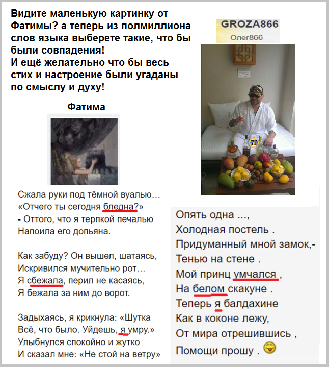 > Я для форума стараюсь — что бы каждый почувствовал себя на Вашем месте — что вот так запросто можно прийти на любой конкурс и открыть в себе какой ни будь спрятанный талант о котором и не подозревал. И тоже получить то отчего давно отвыкли! > > Вы лучше напишите: желаете что бы Фатима свою аватарку сменила — на ту самую?! я уже написал что сам того желаю — но одного моего мнения мало — тут нужно требование коллектива