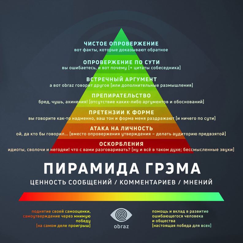 Тема навеяна слишком академичной темой от Ам-Ми — с привлечением «пирамиды Грэма». На которой он весь такой чистенький и пушистый учит правильной аргументации варваров из преисподней! Поэтому я нарисовал другую — и более доходчивую картинку как выглядит пирамида диалога двух стихий. И прошу прощения что нарисовал её вертикальной — просто так рисовать легче. На самом деле она горизонтальная и не может выражать чьё-то превосходство.