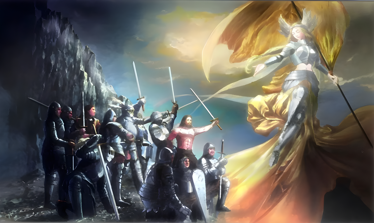 Щит в левой руке и меч в правой более естественно смотрелись бы на этой композиции: