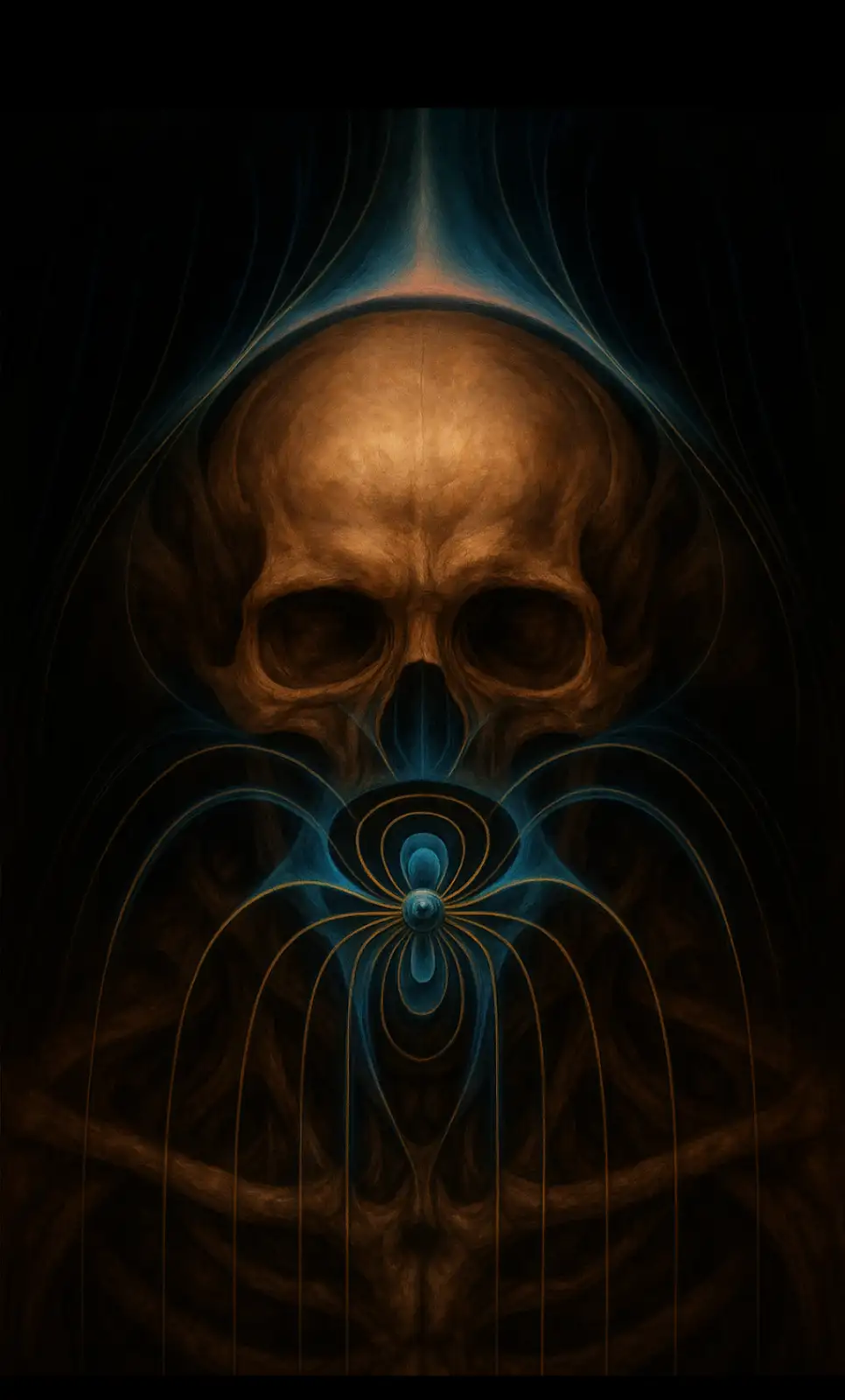 Современные исследования в области нейронаук, физики поля и культурологии всё чаще обращаются к метафорическому осмыслению человека как структуры, включённой в космический континуум. Рассматриваемый художественный образ, сочетающий череп и линии магнитного поля, представляет собой удачный синтез научного и философского мировоззрения. Он соединяет анатомическую основу человеческого бытия с энергетической реальностью, которая выходит за пределы физиологии. Первая часть образа восходит к физике магнитосферы: линии, исходящие от центра, напоминают модель магнитного поля Земли. Эта структура указывает на двуполюсность, симметрию и непрерывное движение энергии. Вторая часть — череп — является символом не только анатомии, но и вместилища сознания. В культурной традиции череп трактуется как знак памяти, предела и одновременно — как сосуд, в котором рождаются мысли. При наложении этих двух пластов возникает новая интерпретация: человеческое сознание видеться как магнитное поле, включённое в единую космическую матрицу. 1)Череп — концентрат человеческого опыта, граница индивидуального. 2)Магнитные линии — образ энергии, жизненной силы и связей между внутренним и внешним. 3)Световые акценты — символ дыхания Вселенной, ноосферного пульса. Здесь проявляется образ человека как "антенны" или "резонатора", способного принимать и передавать сигналы из более широкого информационного поля. Человек как узел сети. Индивидуальное сознание не автономно, оно встроено в глобальную структуру Разума, охватывающего планету. Материя и энергия. Костная структура символизирует плоть, магнитное поле — дух; их слияние говорит о целостности бытия. Предел и бесконечность. Череп как граница — поле как беспредельность: их объединение указывает на диалектику конечного и бесконечного в человеческом существовании. Таким образом, данный художественный образ может быть интерпретирован как философская метафора Спаса — науки о целостности человека. Он соединяет биологическое и энергетическое, индивидуальное и универсальное, личность и космос. Символический анализ позволяет утверждать, что подобные визуальные синтезы способны играть роль мостов между наукой и духовной культурой, раскрывая новую перспективу на природу человека.
