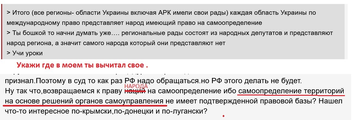 > Итого (все регионы- области Украины включая АРК имели свои рады) каждая область Украины по международному право представляет народ имеющий право на самоопределение > Ты бошкой то начни думать уже…. региональные рады состоят из народных депутатов и представляют народ региона, а значит самого народа который они представляют нет > Учи уроки