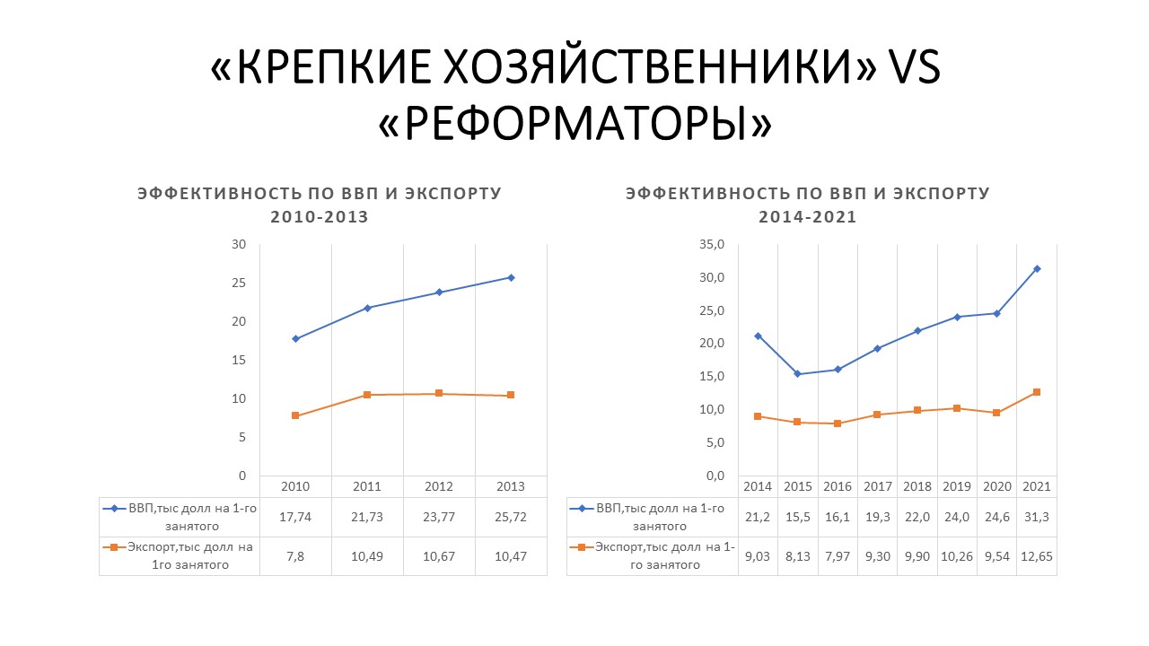 А теперь давай по словам.Уверен,ты написал и не подумал что ты написал.Хотя эту "мысль" ты не первый раз повторяешь,значит ты просто не понимаешь смысл категории "эффективность" и "производительность" И ответь сам себе на один простой вопрос.Я его на примере сформулирую. 2 рабочих кладут на пределе своих возможностей под наблдюением "надсмотрищов" по 1000 кирпичей за смену.Итого-2000 штук. Одному упал кирпич на голову.И остался один.Один рабочий стал вырабатывать то,что он мог на пределе -1000 кирпичей.Какой результат? Минус один рабочий-минус 1000 кирпичей. Твоя фраза -полностью этому противоречит и ты написал,что производственные возможности 1го рабочего-больше чем 2х.Перечитай еще раз! Твоя цитата "значит весь твой «рост» только за счет снижения количества рабочих внутри страны" А теперь представь продолжение этой истории.Увидев,один рабочий хоть ты что не делай ну не может он больше класть. Почухав репу,начальство нашло выход-они купили тачку и сделали лебедку на леса и рабочий,который половину времени тратил на то,чтобы кирпичи к стене перенести,стал тратить на это не 4 часа,а 10 минут.И смог довести выработку за счет этого до 2000 кирпичей за смену. Вот этот рост с 1000 до 2050 кирпичей и есть показатель производительности и рост был обеспечен не тем что еще одного рабочего наняли,а тем что тачку и лебедку привезли. Без тачки и лебедки -ничего не вышло бы. Теперь вернемся к росту ВВП,которого не было.Вспомним пару цифр.Численность занятых на предприятиях -уменьшилая на 1+ млн.(минус один условный рабочий),а выработка к 21 году увеличилась с 25 тыс долл до 31 тыс долл.Меньшим количеством-стали производить больше .О чем это говорит? Догадался? Или нет? Вспомним историю выше-1 работник мог класть только 1000 до тех пор пока....Правильно!Молодец!Пока тачку и лебедку не привезли! И если "условный работник" производил на 25 тыс долл а стал производить на 31 тыс долл,то это означает,что "тачку и лебедку" подвезли.И никаких других вариантов,как не верти-здесь нет.А что для совокупного производства такой "тачкой и лебедкой" является? То,что ты в упор не хочешь видеть-это какие-то изменения в "правилах игры":изменение бизнес климата,нормализация макропоказателкей,таргетирование инфляции ,фискальные изменения, новые возможности для экспорта,снятие искусственных предпосылок для убыточности экспорта,те то,что называется институциональными изменениями. Надеюсь,что ты понял что за счет уменьшения численности-рост результата не происходит?