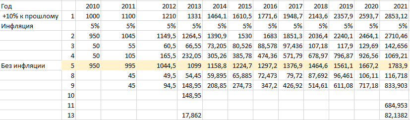 Как ты видишь, если использовать твой расчет, то рост приведенной к 2010 г, <nobr>т. е.</nobr> очищенной от инфляции средней заработной платы за 4 года 2010 -2013,включительно, составил 17,9%, рост заработной платы за период 2014—2021 -82,1% При этом как я писал выше, вторая строка, это каждый новый года + 10% к прошлому году. Т. е. итоговый процент должен быть одинаковый за оба периода. Впрочем тот расчет который предложил я, он тоже не дает сходимости. Где-то в твоей таблице есть погрешность, но я ее не нашел. Максимальна сходимость идет если брать строку 5 и попробовать высчитать сложных процент, но в обратную сторону. Формула сложного процента с капитализацией