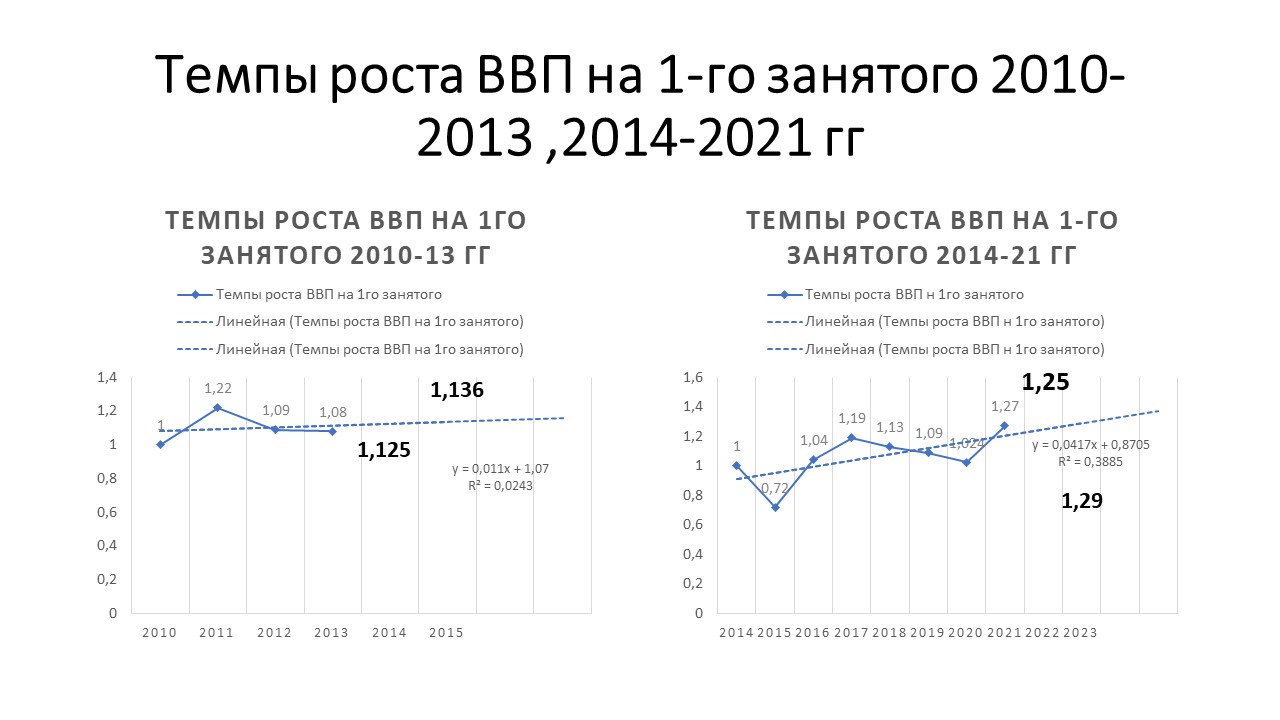Ну вот они-линии тренда .Но я сделал немного интересней. Чтобы понять какая модель эффективнее стоит посмотреть на то,с какой скоростью происходит рост.Это надо еще и смотреть,потому что в новой модели росту предшествовал сильный спад.Ну и по твоей просьбе я добавил линию тренда и посчитал какой рост в одном и другом случае может быть Итого."хозяйственники" могли бы обеспечить рост 12 и 13 %% за 2 последующих периода,"реформаторы"- 14 и 29%% за 2 последующих периода. Ну собственно разницу видно по углу линии тренда.Я даже не стал как-то комментировать спад 20-го года -короновирус. Дальше еще интересней.Думаю на семинарах по статистике тебе приходилось решать задачки по приведению индексов.Этим методом можно определить за счет чего произошел рост-эстенсивных/интенсивных факторов,численномти/произаодительности труда/изменеия цен. и тд.Использую эту весьма простую методу,для того,чтобы сравнить эффективность. У нас есть все исходные данные-среднесписочная численность и прозводитльность по периодам. Дальше очень просто В 2013 году численность занятых на предприятиях составляла 7406494,в 2021 - 6391660 ВВП на 1го занятого в 2013 году -25,7 тыс долл В 2021- 31,3 тыс долл Определяем каким должно быть ВВП в 2013 году при производительности 2021 и численности 2013 7406494*31,3=231,9 млрд долл,факт 190 млрд,разница -41,9 млрд или 22% А теперь сделаем еще одно "приведение" и посмотрим на то,каким могло быть ВВП в 13 при численности 2012 и производительности -2013 6381660*25,7 тыс долл=164,4,что ниже факта -190 млрд на 25,6 млрд.Это еще один индикатор того,что две модели отличаются эффектиностью ,а причина ее повышения-институциональные изменения,т.е. эффект изменения бизнес среды