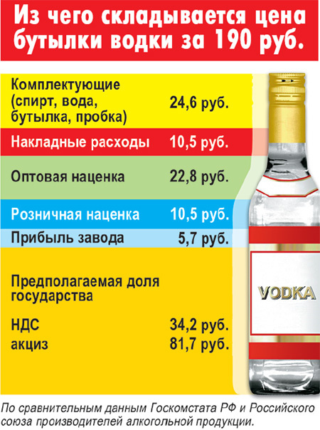 А вот теперь и подумай почему паленой водкой выгодно торговать и ей будут торговать… Государство фактически забирает половину стоимости бутылки водки и это причем те деньги с которых ВЫ уже заплатили государству, так называемое двойное налогообложение… Тобишь государство само провоцирует торговать паленой водкой, а так как это ему не понравилось ввели кучу систем учета, надзора которые опять же входят в стоимость той самой водки. Поэтому магазинам ничего не остается как выставлять минимальную стоимость, ибо поля для конкуренции нет, дорогую водку редко кто покупает потому как водка она и в Африке водка состав известный… То же самое с бензином… Государство свои загребущие рученки везде хочет засунуть и по два раза обложить … просто налоги теперь они называют по разному чтобы понимать где и кого и как обули… Посвежее рисунка не нашел, но чтобы понятно было: