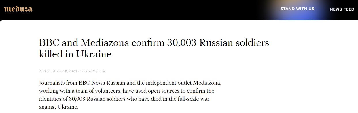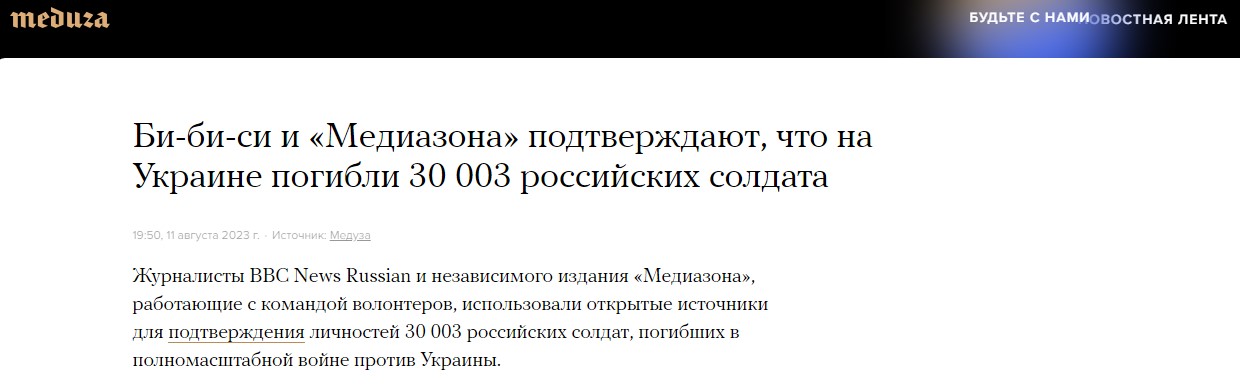⍟ Willly_Kurz (Willly_Kurz), сказочник, Би-би-си и «Медиазона» подтверждают, что на 11 августа 2023 г. на Украине погибли 30 003 российских солдата, ни о каких 300 000 погибших российских солдатах ни ВВС, ни «Медиазона» ничего не знают — ты о каких 300 000 погибших россиянах врешь, да еще привираешь, что я с этим согласен?…