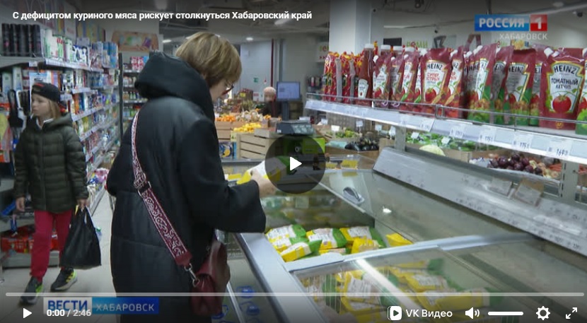 > > На поиски – в следующий магазин. Здесь ассортимент существеннее, в том числе, за счёт бройлеров от дальневосточных производителей. Всё остальное на прилавках – из Беларуси, Белгорода, Алтая и Томска – и это половина всей ввозимой в регион курятины. Ретейлеры подтверждают: объемы поставок уменьшились. >