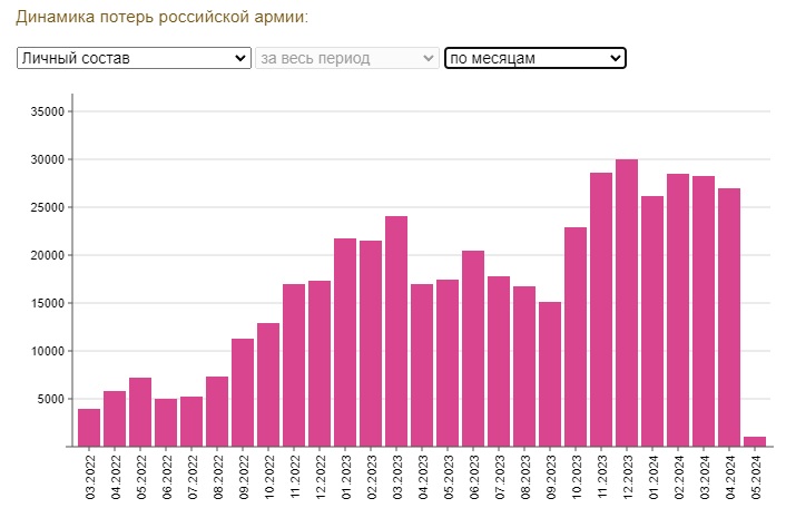 02.05.2024 Танки — 7332 (+20) ББМ — 14096 (+29) Артиллерийские системы — 12044 (+20) РСЗО — 1053 Средства ПВО — 784 (+4) Самолеты — 348 Вертолеты — 325 БПЛА — 9561 (+23) Крылатые ракеты — 2126 Корабли (катера) — 26 Подводные лодки — 1 Автомобили и автоцистерны — 16224 (+49) Специальная техника — 1988 (+8) Личный состав — около 470870 человек (+1030)