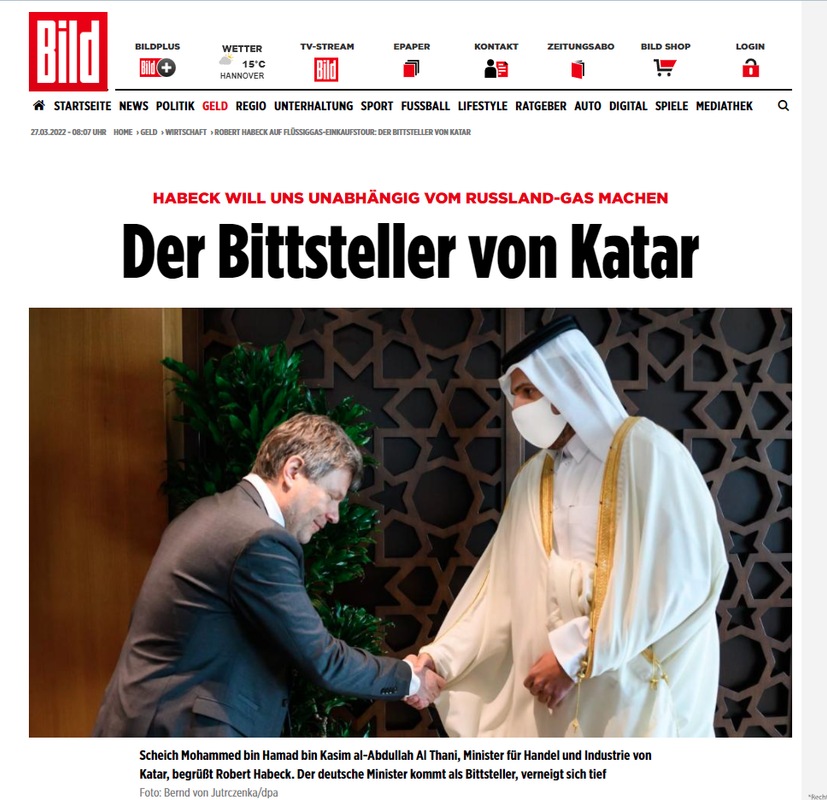 как немецкий министр в Катар за газом ездил: там ему позволили низко кланяться министру торговли и промышленности Катара шейху Мохаммеду бин Хамаду бин Касиму аль-Абдулле Аль Тани, но газа не дали...