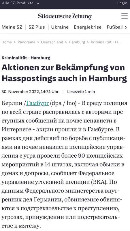 Вчера полицейские штурмовали более 90 квартир в 14 федеральных землях. Предлог: граждане критиковали правительство в Интернете, обвинения сводились к оскорблениям (со стороны политиков), клевете и подстрекательству к мятежу.