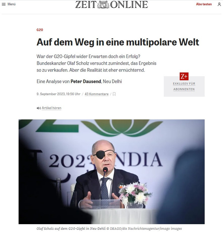 Немецкая газета Zeit написала о том, что итоговая декларация саммита G20 в Нью-Дели нарушила планы немецкого канцлера Олафа Шольца «о пощечине России»… Zeit: итоговая декларация саммита G20 нарушила планы Шольца о «пощёчине» России 9. September 2023