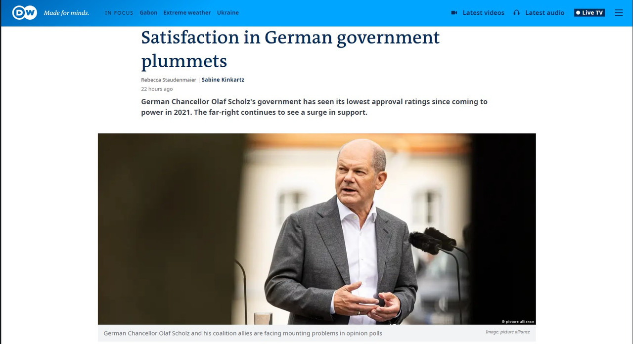 Стоит отметить, что по данным последних опросов, большинство немцев сейчас недовольны работой канцлера Олафа Шольца впервые с момента его вступления в должность в 2021 году.