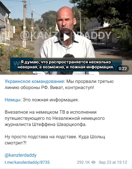 "Я думаю, что распространяется неверная, а возможно, даже ложная информация. Сообщается о прорыве третьей линии обороны в районе Запорожья. По имеющейся у нас информации, нет ничего даже близко похожего на порыв русской обороны" , - заявил Шварцкопф.