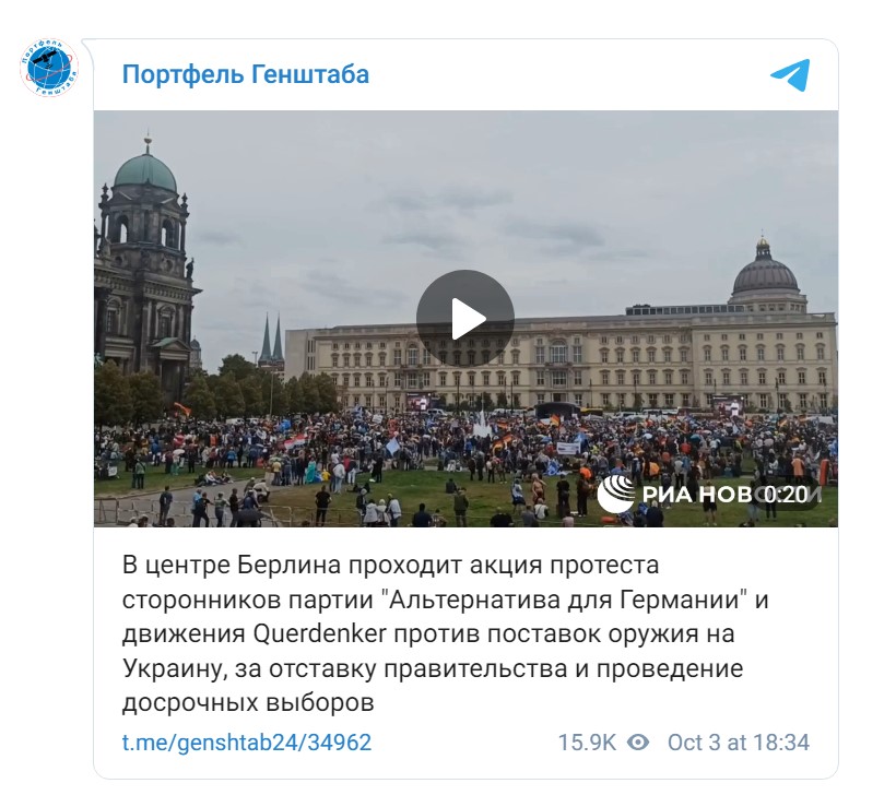 Самые масштабные протестные акции в Берлине 03.10.2023 Это не «Альтернатива для Германии», как написали некоторые российские СМИ. В протестах также участвует большинство политических сил страны.