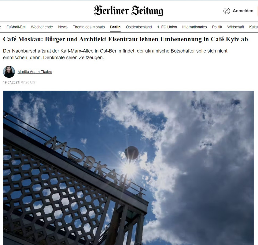 В середине мая посол Украины в Германии Алексей Макеев и живущие в немецкой столице выходцы из республики потребовали изменить название архитектурного ансамбля кафе «Москва» на кафе «Киев».