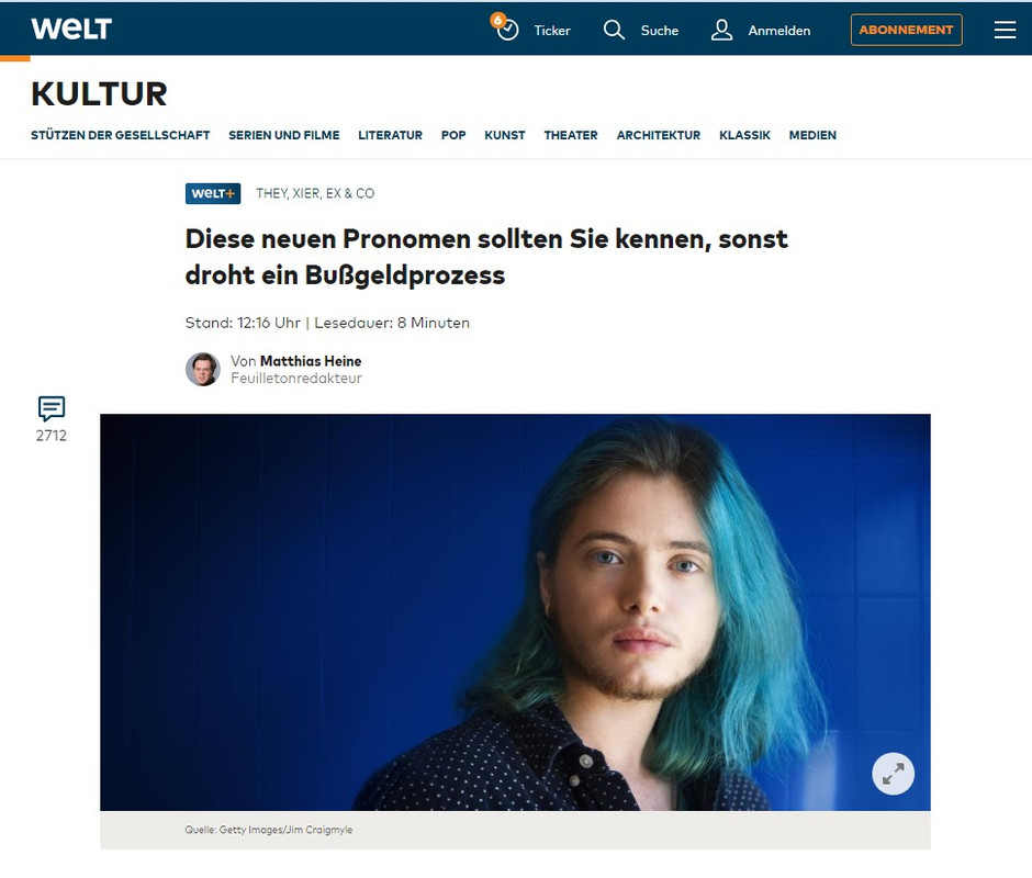 Неправильное применение гендерных местоимений в Германии вскоре будет грозить штрафом в размере до €10000, пишет Die Welt. С первого августа здесь вступает в силу «Закон о самоопределении». Активисты нетрадиционной ориентации уже предвкушают множество судебных исков.