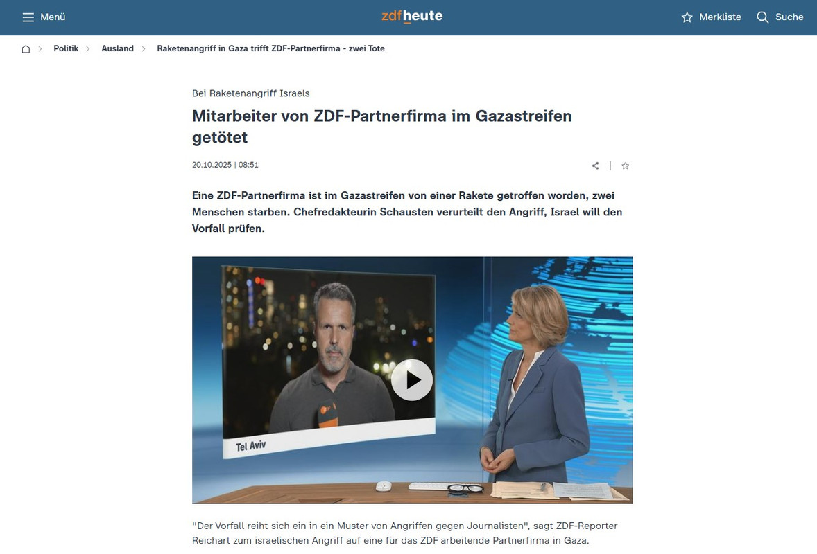 20 октября от авиаудара Израиля по сектору Газа погиб работавший на германский телеканал ZDF сотрудник медиакомпании Palestine Media Production (PMP). Об этом сообщается на сайте телеканала.
