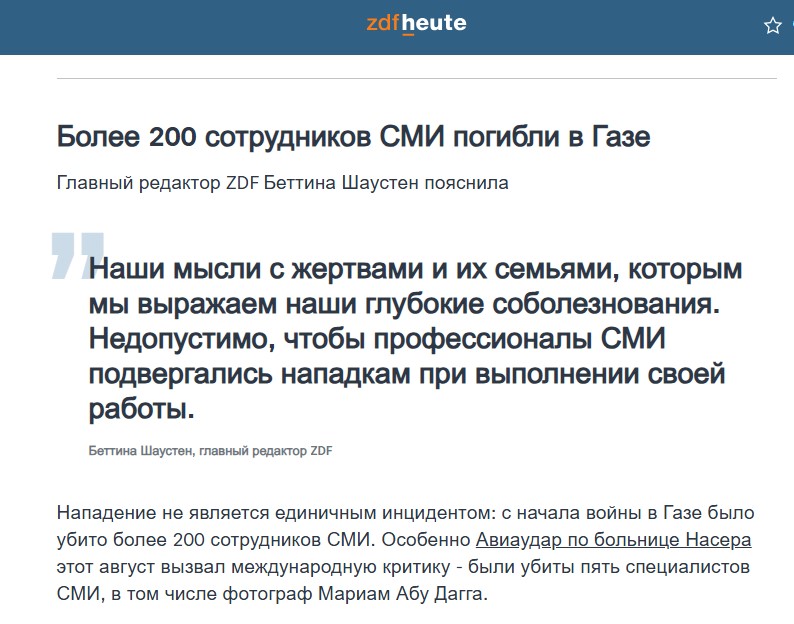 «В воскресенье днём в городе Дейр-эль-Балах на юге сектора Газа ракета попала в офис компании медиапроизводства Palestine Media Production (PMP), которая тесно сотрудничает с ZDF. В результате удара погибли два человека», — сообщает телеканал. Ими оказались инженер компании и восьмилетний сын еще одного сотрудника. Один журналист PMP получил ранения.