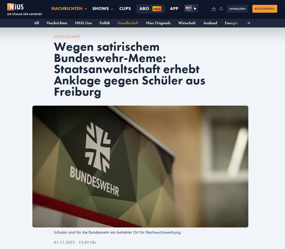 «Никто не ожидал, что бундесвер подаст жалобу из-за мема» Бентик, ученик, который с тех пор попрощался со школой, рассказывает о предыстории в интервью perspektive-online. Он так описывает этот процесс: «В начале февраля этого года моя школа пригласила так называемого молодежного офицера бундесвера на мероприятие, на котором бундесвер должен был быть представлен под девизом „Защитим демократию“. […] Во время самого визита молодежного офицера ничего не произошло, но после этого в Instagram-аккаунте этой школьной газеты был опубликован мем, в котором критиковались перевооружение и появление бундесвера в школах».