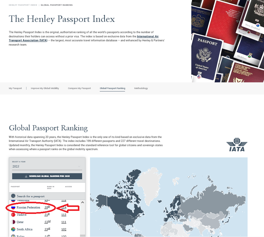 > Паспорт США впервые выпал из первой десятки самых сильных паспортов мира согласно последнему Индексу паспортов Henley, оставленному на основе данных Международной ассоциации воздушного транспорта (IATA). > > > > > Паспорт США занял в рейтинге 12-е место: американцам предоставлен безвизовый въезд в 180 из 227 стран и территорий мира. Это стало заметным падением по сравнению с началом года, когда США занимали девятое место. Сейчас США делят 12-ю позицию с Малайзией. > > «Ослабление позиций американского паспорта за последнее десятилетие — это не просто перестановка в рейтинге. Оно отражает глубокие изменения в глобальной мобильности и динамике мягкой силы», — заявил в пресс-релизе доктор Кристиан Х. Кэлин, председатель компании Henley & Partners. > > «Государства, которые открыты миру и готовы к сотрудничеству, продвигаются вперед, тогда как те, кто полагается на прежние привилегии, остаются позади». > > Henley & Partners объяснили падение позиций американского паспорта, в частности, потерей безвизового режима с Бразилией из-за отсутствия взаимности и тем, что США не включены в стремительно растущий список стран с безвизовым въездом в Китай. Также США не имеют безвизового доступа, например, во Вьетнам. В то же время въезд в США без визы разрешен лишь гражданам 46 других стран. > > Самым «сильным» паспортом в мире признан паспорт Сингапура, владельцы которого могут посещать без виз 193 страны. На втором месте находится Южная Корея (190 направлений), а на третьем — Япония (189 направлений). > > Латвийский паспорт делит 10-е место вместе с Лихтенштейном, опережая, в частности, Литву (11 место). С паспортом гражданина Латвии можно без виз путешествовать в 182 страны мира. Эстония — на 8 месте. > > Россия на 50 месте в мире с 114 безвизовыми для россиян стран, Беларусь — на 66-м (80 стран). Украина занимает 33-е место. > Недавно россиянам разрешили ездить в Китай. Среди россиян теперь пользуются спросом туристические туры в эту страну, куда они едут за продуктами питания и мобильными телефонами.
