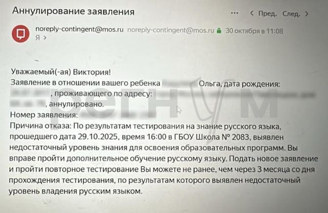 «Сегодня мне позвонила сотрудница Департамента образования Москвы, уточнила все данные и сообщила, что у моей Оли выявлен достаточный уровень знания русского языка для зачисления в школу! Сотрудница попросила нас подать новое заявление для зачисления в школу, которую мы выбрали, и отдельно отметила, что когда придет уведомление о необходимости пройти тестирование на знание русского языка — не обращайте на него внимания, ведь Оля в достаточной мере владеет русским языком. В департаменте пообещали, что теперь всё будет в порядке и новых проблем с зачислением возникнуть не должно», — рассказала ИА Регнум Виктория.