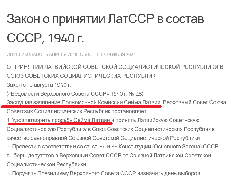 Поздно трепыхаться уже пакт вы заключали в каком году? Вами теперь надо сначала доказать что ваш сейм состовший исключительно из ваших граждан еще независимой Латвии принявший конституцию 1940 года был преступный и его решения не действительны. Прикол в том что об оккупации начали повизгивать лишь после 1945 года