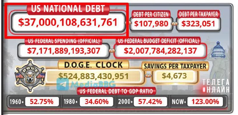 $ 37 004 817 625 842,56 — общая сумма непогашенного государственного долга по состоянию на 11 августа 2025 года, говорится на сайте ведомства.