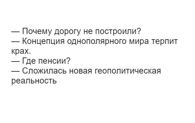 > Все очень легко и просто, форумную провластную братию не нужно обижать, ее уже не раз обидели. Давайте обсудим реальные проблемы связанные с деградацией пропагандизма в России, когда сами пропагандирующие уже не верят своим словам. > > > > Всем привет! Уважаемые форумчане. > > Убедительно отвечаю на этот вопрос. > > Только при достойных зарплатах, пенсиях, социальных пособиях и реальной помощи детям и инвалидам можно говорить о силе и мощи страны. > > Мы обязаны тратить более 80-ти процентов бюджета на социалку, а также образование и медицину, на развитие детского спорта и здорового образа жизни населения. > > Это тогда, когда власть думает о благосостоянии своего народа. > > А у нас она думает про набивание карманов, откаты и распилы. Полиция, которая избивает мирных граждан зарабатывает в два раза больше учителей и врачей. Вместо построение необходимой социальной инфраструктуры мы строим мост другому государству. А якобы миллиардные траты, которые де-факто разошлись по карманам чиновников, тратятся типо на развитие космоса и на постройку истребителей, сбить которые не проблема даже для птички, которая залетела в двигатель! > > С таким оружием и техникой нам не нужны враги, банальная стая журавлей снесет российскую авиацию. Но некоторые продолжают верить что у нас есть что-то серьезное и мы можем на что-то ответить. > Экономика зависимая, ее легко разрушить санкциями или падением цены на нефть — оп, и уже в два раза больше доллар. > > Действительно, есть только одно объяснение почему эту власть кто-то оправдывает — их очень сильно обманула власть и поставила на колени, но признать это, значит расписаться в собственной глупости, а гордость, это последнее что осталось у псевдопатриотов. Поэтому даже сидя на лавочке под шафэ они будут орать — Россия Великая, Великая, Великая! >