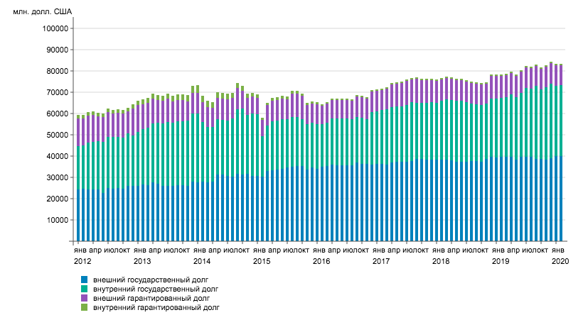 > > Полностью структура государственного и гарантированного государством долга по данным Министерства финансов Украины на <nobr>29.02.2020</nobr> показана в следующей таблице: >