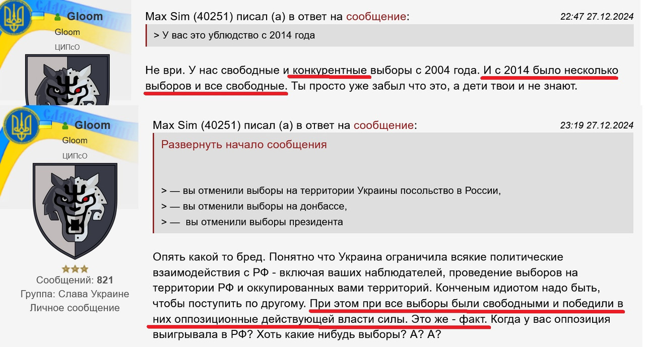 Ну и в-четвёртых: «у вас было запрещено озвучивать убеждения большинства украинцев „конфликт в Украине является внутренним делом“» — твоя фраза и в ней ни чего про выборы. А это уже прямая ложь.