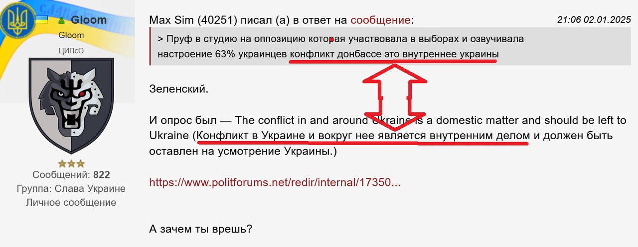 Ты даешь ссылку на свою цитату, которое содержит несколько ложных и опровергнутых ранее утверждений. Во первых не было ни каких 63% украинцев убеждённых в том что в Украине была гражданская война. Ты взял цифру из другого опроса, и тупо вставил свой вариант ответа. Уже на этом можно было бы и остановиться. Во вторых у нас были представлены все политические силы, в том числе которые называли российскую. агрессию внутренним конфликтом и прямо работали на РФ — ОПЗЖ. В третьих, у нас не был подобных запретов вплоть до 2022 года.