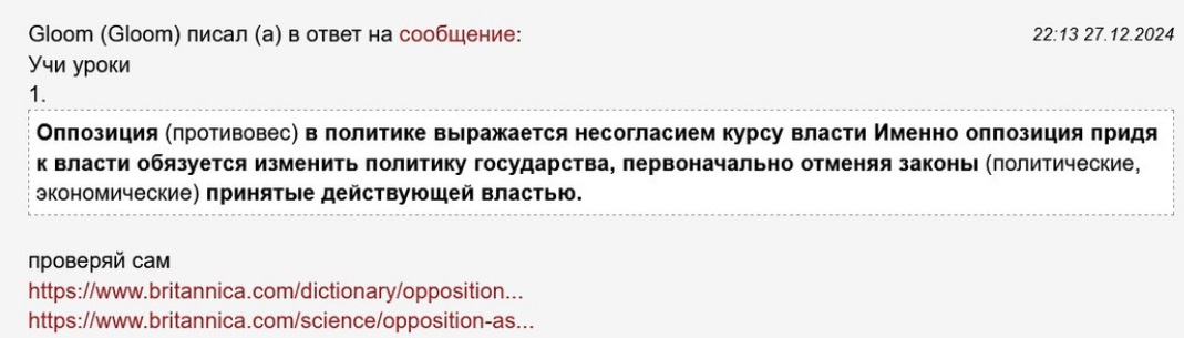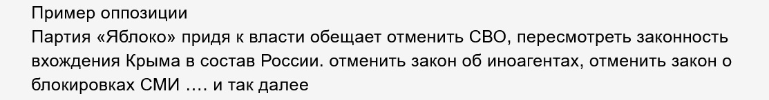 НЕТ … дал же ссылки… именно обещание сменить курс отменой законов — оппозиция, все остальное противободрствующие оппоненты рвущиеся до власти Оппозиция (противовес) именно законодательная смена политики действующей власти… просто законы ужесточение борьбы с коррупцией не прокатывают Пример оппозиции Партия «Яблоко» придя к власти обещает отменить СВО, пересмотреть законность вхождения Крыма в состав России. отменить закон об иноагентах, отменить закон о блокировках СМИ …. и так далее