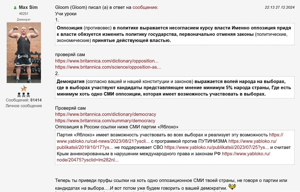 Твое яркий пример как вас болванят о наших реалиях … Я же давал выше ссылки …. ОК повторю еще раз что не вам жевать нам об оппозиции и демократии Партия Яблоко принимает участие практически во всех выборах России ПРОВЕРЯЙ Депутатов партии Яблоко народ уже избрал на выборах ПРОВЕРЯЙ