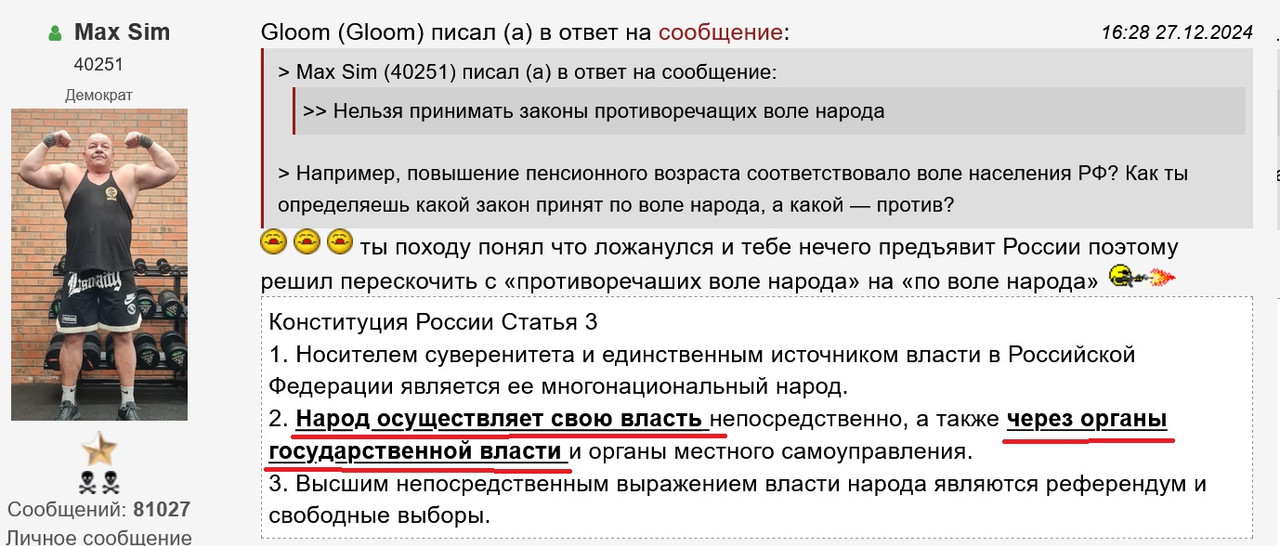 > > Я лажанулся? Это ж ты заявил, что российская власть блюдёт волю народа и законы принимает которые не противоречат его воле. Например повышение пенсионного возраста. > Вот я тебя и спрашиваю, а механизмы какие есть в РФ, чтоб эту самую волю блюсти. Вот кто-то спрашивал российское население о необходимости захватывать Крым и начинать войну с Украиной? Референдум какой был или, может, в своей избирательной компании об этом кто-то говорил? А?