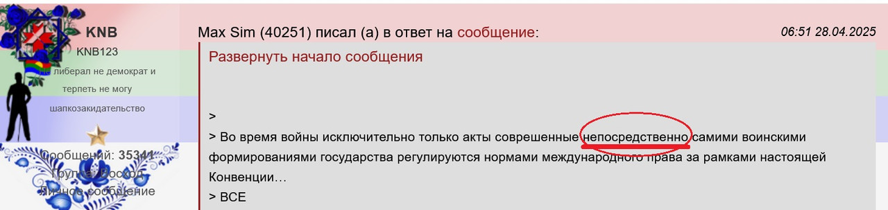 > поздно трепыхаться пытаясь вывернулся что ложанулся, но в итоге ещё глубже сам себя макнул > Учи конвенцию… если именно непосредственно сами военно служащие Украины совершили акт лишь тогда можно было пытаться говорить что это за рамками конвенции >