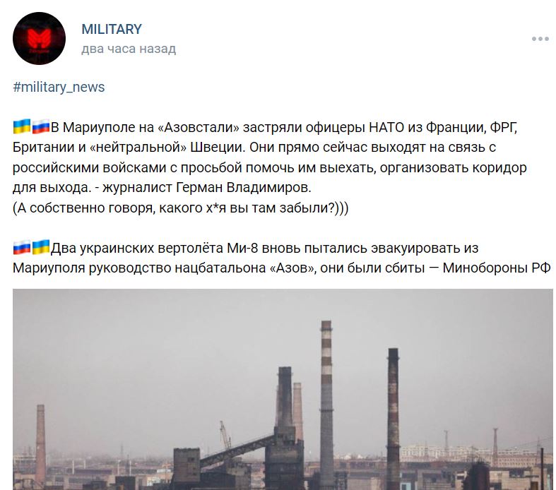Да жырновато как то. Там на этой Азовстали кого только не ловили и не хоронили - но всё пока что только в интернете. Хотя, глядя на то какую движуху вокруг этих окруженцев аж целые макроны с эрдоганами отплясывают - не исключено что кто то там и сидит. Не будут же раз за разом через местность насыщенную пво просто так вертушки гонять и гробить - и уж явно не ради тарасов из навоза это делают: на тех тарасов уже походу все болт забили.