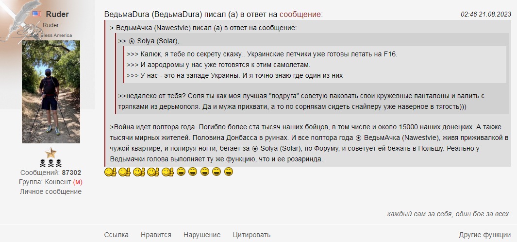 > Я у него толь в игноре, толь в игноре. :)) Ниапщаицца со мной больше! > В отместку мне лайкает посты, где бесицца Котя с «раковой шизофреничкой, которая получила власть». > Так что не могу, Ведьм… не мой «уровень развития». Мне такие не атвичают. Нидоразвитая я…