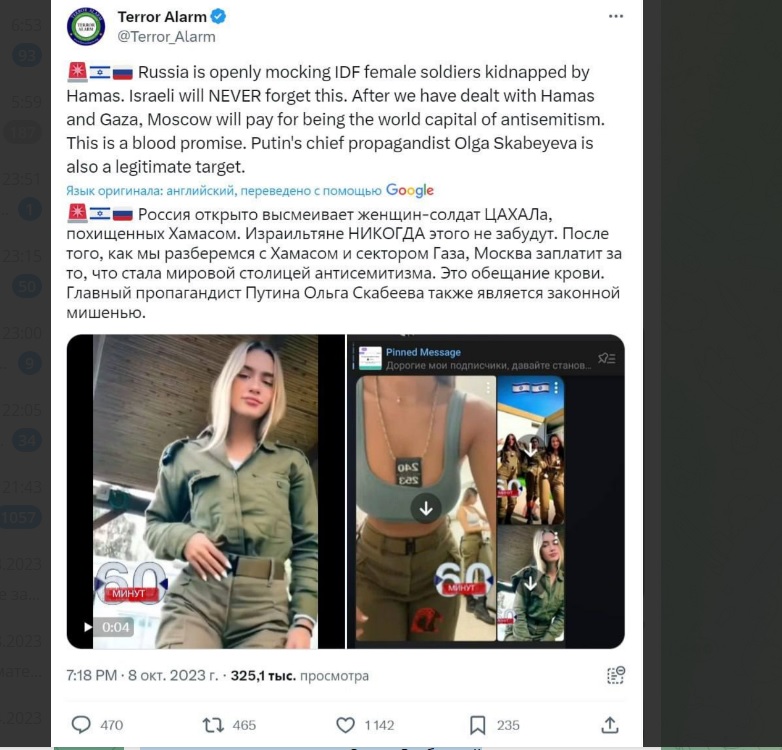 > После того как мы разберемся с Хамасом и Сектором Газа, > Москва заплатит за то, что стала мировой столицей антисемитизма. > Это обещание крови.