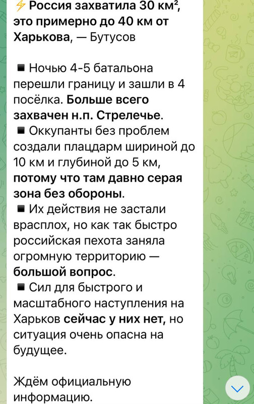 Бутусов разгоняет зраду на тему происходящего на границе Харьковской области. С нашей стороны больший акцент идет на эффективности артиллерийских и ракетных ударов по силам противника на севере Харьковской области.