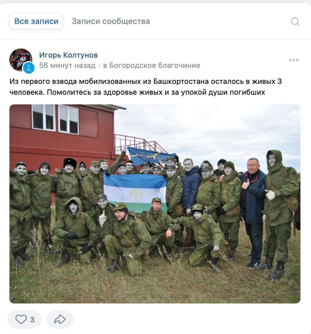 Из 25 человек мобилизованных в живых остались трое — 88% погибли. Не ранены, не комиссованы по инвалидности, а именно погибли. Вот вам и реальная картина потерь российской армии без розовых очков.