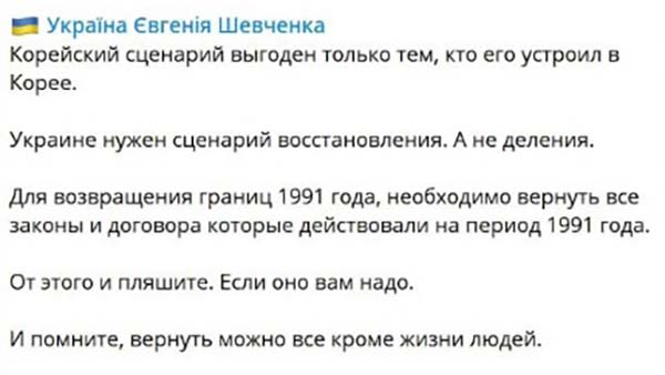> Запад начал муссировать тему разделения Украины по «корейскому сценарию», т. е. предлагается часть страны отдать под влияние России, а остальное под Запад.