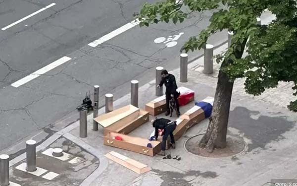 Полиция заявила, что мотивы этих людей не понятны, хотя на гробах было написано о чем идет речь. Ранее Макрон обещал послать французов воевать на Украину.