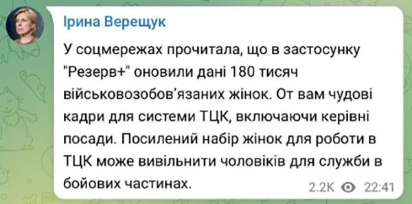 >>>>> >>>>> >>>>> Верещук предлагает мобилизовать женщин для службы в ТЦК, а пристроившихся там людоловов с контузиями и инвалидностями погнать на фронт как имеющих боевой опыт.