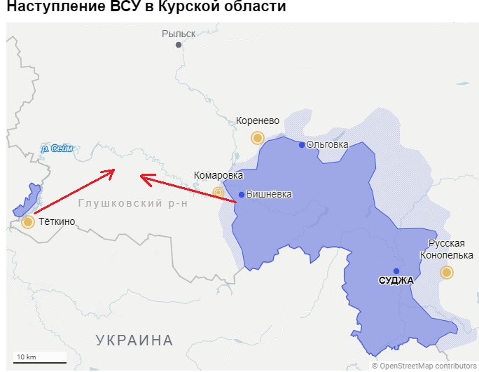 "Пророссийский телеграм-канал Архангел Спецназа Z сообщает, что ситуация напряженная. «Были накаты со стороны Вишнёвки на Комаровку, но для врага они оказались безуспешны, — сообщает пророссийский блогер. — На Коренево тоже были попытки накатов, но их отбили. В Теткино все осложняется тем, что противник атакует вышки, с целью оставить без связи. В Свердликово ВСУ стягивают личный состав, видимо, с целью идти на Коренево и Комаровку».